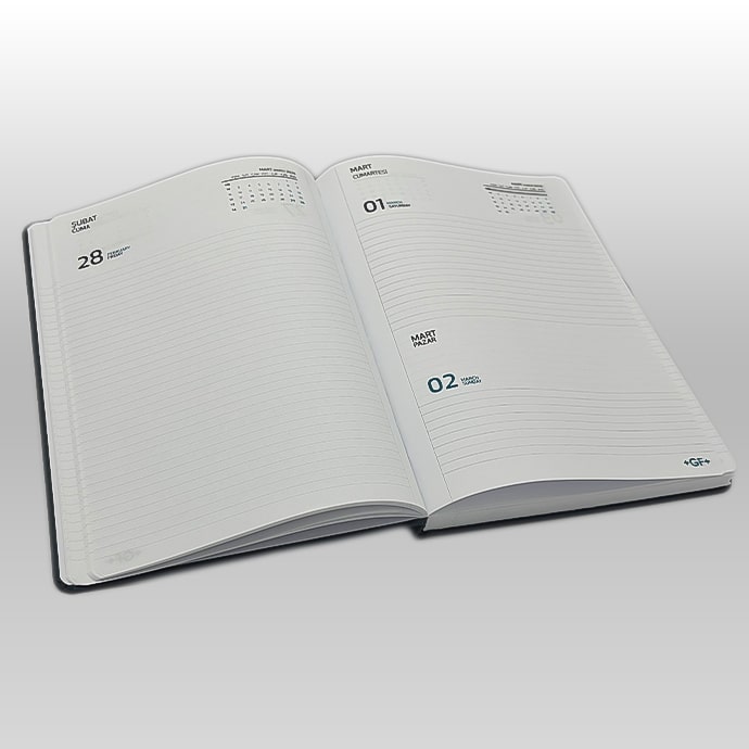 Profesyonel matbaa üretimiyle hazırlanan suni deri günlük ajandalar, kurumsal firmalar için prestijli bir promosyon ürünü olarak öne çıkar. Kapak üzerine logo, marka adı veya özel tasarım uygulamaları; sıcak baskı, gofre veya dijital baskı teknikleriyle şık bir şekilde uygulanabilir. Böylece ajanda, yıl boyunca kullanılan etkili bir tanıtım aracına dönüşür ve marka bilinirliğini artırır.